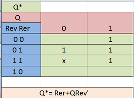 Su funcionamiento es muy básico, cuando Rer es un 1 y Rev 0 su salida se va a mantener en 1, cuando el tiempo del semáforo se cumple se envía un pulso a Rev lo que genera que Rer=0 y Rev=1 generando asi un 0 a su salida y manteniéndolo hasta volver a recibir un pulso de Rer.