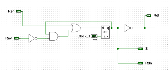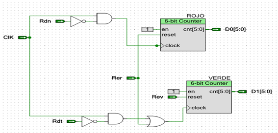 El circuito interno de este elemento se ve en la imagen anterior y su funcionamiento consiste en que si el Rdn es 0 va a activar el reloj del contador rojo lo cual lo coloca en funcionamiento, lo mismo ocurre para la entrada Rdt, además de esto se usa el pulso Rer para resetear el contador rojo y Rev para resetear el contador verde.
