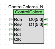 El controlador de colores es un dispositivo que se encarga de seleccionar en que casos se acciona uno de los contadores para los dos colores, esto quiere decir que cuando sus entradas son las requeridas iniciara el conteo del tiempo para la luz roja o la luz verde, por ello su salida es de cinco bit ya que el conteo realizado va hasta 60, la salida D0 es la salida del contador para el led rojo, la salida D1 es la salida del led verde.