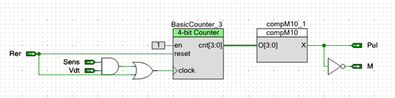 En la figura anterior se muestra el circuito que contiene este componente, solo cuando Vdt y Sens se encuentran en un 1 logico el contador comenzara a trabajar, y dara una salida a un comparador que genera un 1 logico cuando el valor del contador es igual a 10, de lo contrario generara un 0, por ultimo la entrada Rer cumple la función de resetear el circuito y la salida M es Pul’.